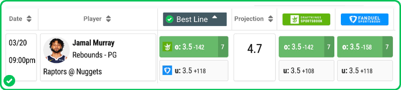 Action PRO is projecting 4.7 points rebounds for Jamal Murray in the Nuggets' matchup against the Raptors tonight, providing a solid 10.3% edge against his current prop line of over/under 3.5, which is good enough to tag the Over with an B grade in our system.