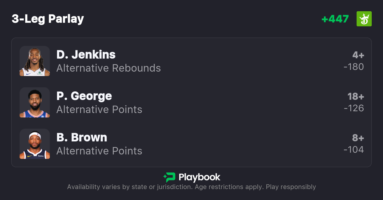 Jenkins isn't just filling in; he’s playing heavy minutes. As a starter over the last eight games, he is averaging 36.2 minutes and 4.4 rebounds per contest. His minutes floor, alone, provides a massive safety net for a 3.5-rebound prop.