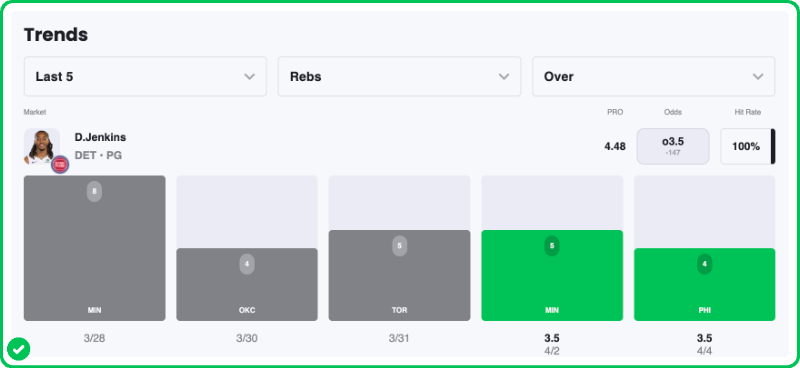Jenkins has cleared this total in five straight games, tallying 4, 5, 5, 4, and a career-high 8 rebounds in that stretch. He’s shown a high motor in transition, often crashing the defensive glass to jumpstart Detroit’s fast break.