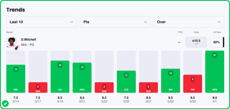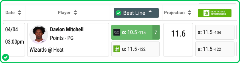 Action PRO is projecting 11.6 points for Davion Mitchell in the Heat's matchup against the Wizards today, presenting a solid 11.8% edge against his current prop line of over/under 10.5, which is strong enough to mark the Over with a B grade in our system.