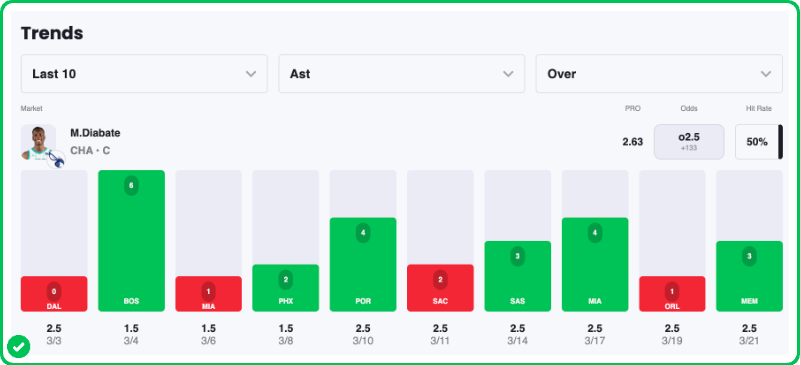 Believe it or not, though, Diabate's assist numbers have actually been pretty reliable. He has tallied 3+ assists in four of his last six games, while reaching 4+ assists in two of those contests.
