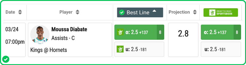 Action PRO is projecting 2.8 assists for Moussa Diabate in the Hornets' matchup against the Kings tonight, showing a solid 9.1% edge against his current prop line of over/under 2.5, which is strong enough to tag the Over with a B grade in our database.