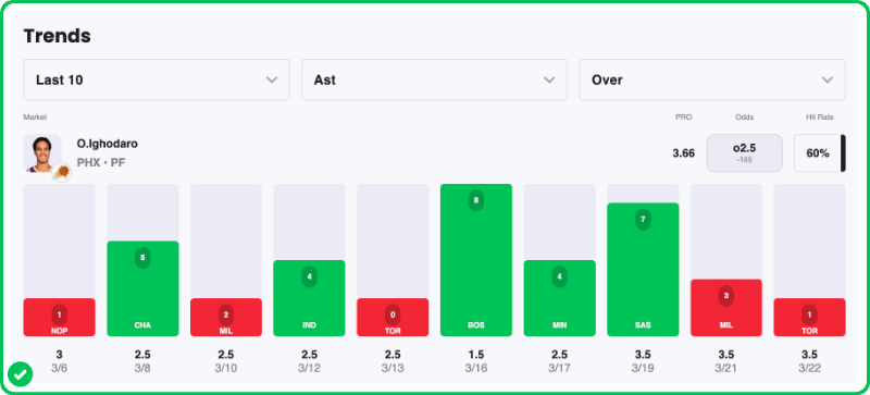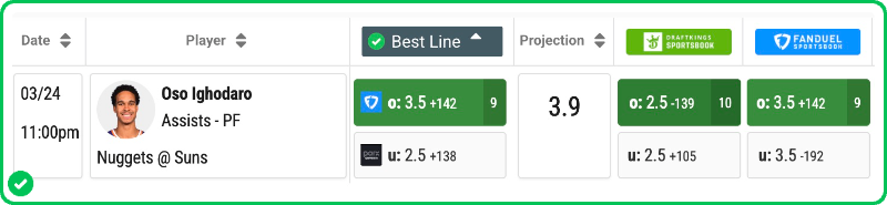 Action PRO is projecting 3.9 assists for Oso Ighodaro in the Suns' matchup against the Nuggets tonight, presenting a nice 8.5% edge against his current prop line of over/under 2.5, which is good enough to tag the Over with a B- grade in our system.