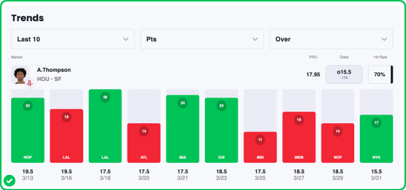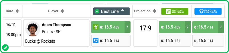 Action PRO is projecting 17.9 points for Amen Thompson in the Rockets' matchup against the Bucks tonight, showing a huge 16.4% edge against his current prop line of over/under 16.5, which is strong enough to tag the Over with an A- grade in our system.