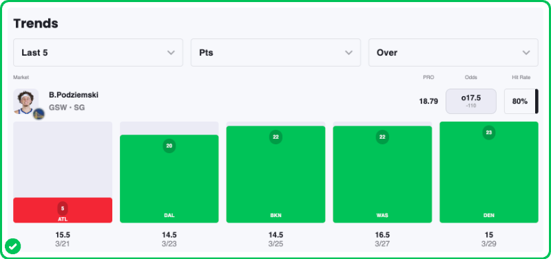 Podziemski has scored 20+ points in four straight games entering tonight's contest — and while the Warriors draw an undeniably tough matchup against San Antonio tonight, we still see value in backing him to clear this line.