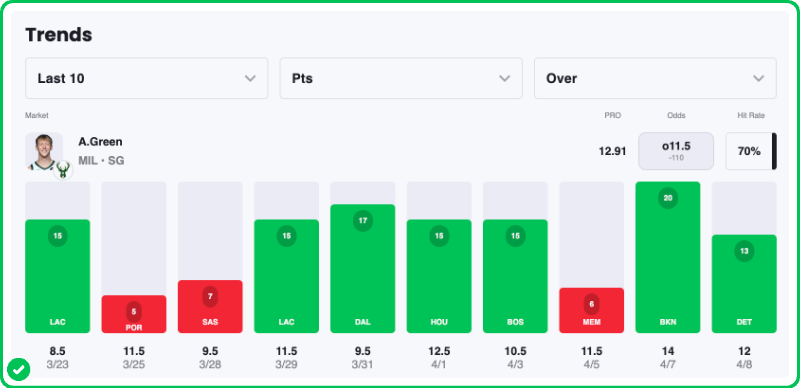 Green has been a flamethrower lately, clearing 13 points in six of his last seven outings. Even more impressive is the ceiling he’s shown during this stretch, hitting at least 15 points in five of those seven games.