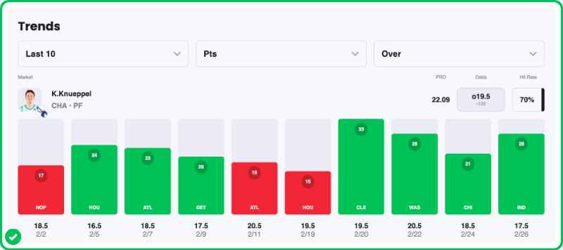 Dating back a little bit further, Knueppel has also scored 20+ points in seven of his last nine games, with his lowest point totals during that span ringing in at 15 and 18 points, which gives us a solid floor for this prop.