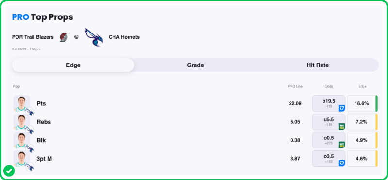 Action PRO is projecting 22.09 points for Kon Knueppel in the Hornets' matchup against the Trail Blazers today, presenting a solid 16.6% edge against his current points prop line of over/under 19.5, which is strong enough to give the Over an A- grade in our database.