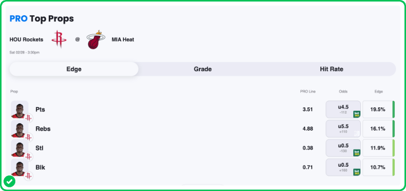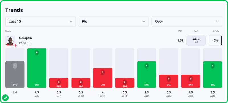 Action PRO is projecting 3.51 points for Clint Capela in the Rockets' matchup against the Heat today, giving us an excellent 19.5% edge against his current points prop line of over/under 4.5, which is good enough to tag the Under with an A-grade in our database.