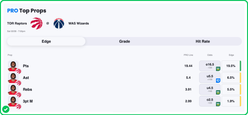 Action PRO is projecting 19.44 points for Immanuel Quickley in the Raptors' matchup against the Wizards tonight, showing a sturdy 19.5% edge against his current points prop line of over/under 16.5, which makes the Over another A-graded play in our database.