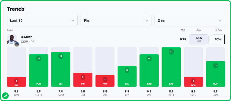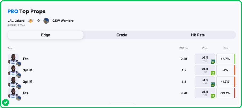 Action PRO is projecting 9.78 points for Draymond Green in the Warriors' matchup against the Lakers tonight, providing us with a solid 14.7% edge against his current points prop line of over/under 8.5, which is good enough to give the Over a B+ grade in our database.