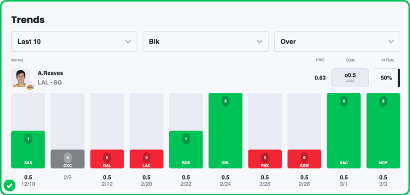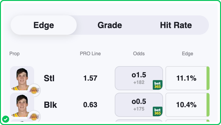 Action PRO is projecting 0.63 blocks for Austin Reaves in the Lakers' matchup against the Nuggets tonight, presenting a solid 10.4% edge agains his current prop line of over/under 0.5, which is good enough to tag the Over with a B-grade in our database.