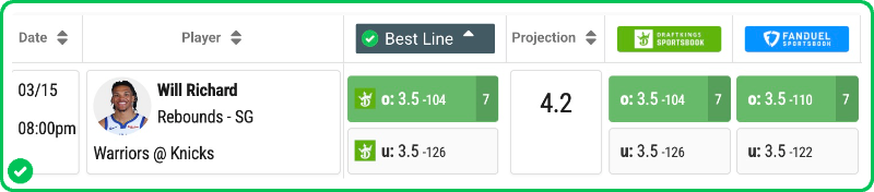 Action PRO is projecting 4.2 rebounds for Will Richard in the Warriors' matchup against the Knicks tonight, presenting a solid 9.5% edge against his current prop line of over/under 3.5, which is good enough to tag the Over with a B- grade in our database.