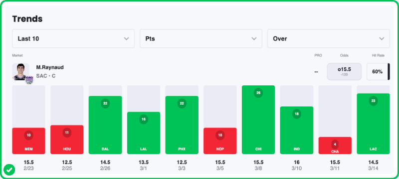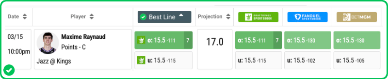 Action PRO is projecting 17.04 points for Maxime Raynaud in the Kings' matchup against the Jazz tonight, showing an excellent 10.8% edge against his current prop line of over/under 15.5, which is strong enough to tag the Over with a B grade in our system.