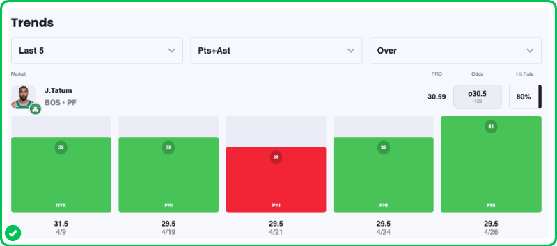 Tatum has cleared this 30.5 Points + Assists line in three of the four games this series, effectively balancing his role as a scorer and a playmaker. He is currently averaging a combined 33.3 P+A (24.8 PPG and 8.5 APG), proving that he can punish the Sixers' defense regardless of how they choose to shade him.