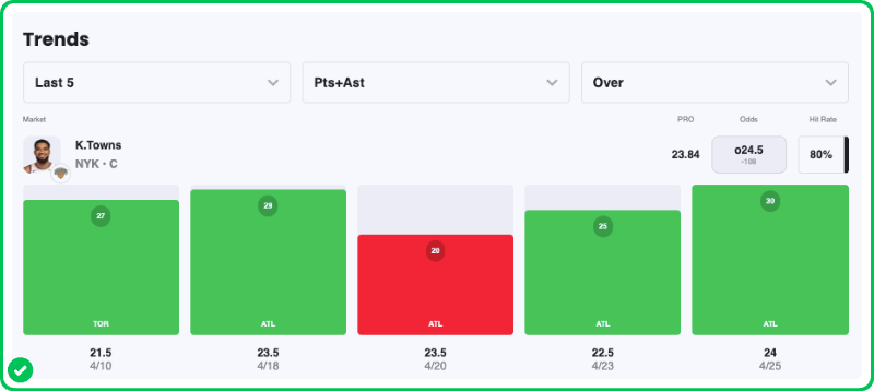We’ve already waxed poetic about how favorable this matchup is for Towns, and the data backs it up: he has cleared this 24.5 line in four of five games this series and in five of six meetings against Atlanta this season.