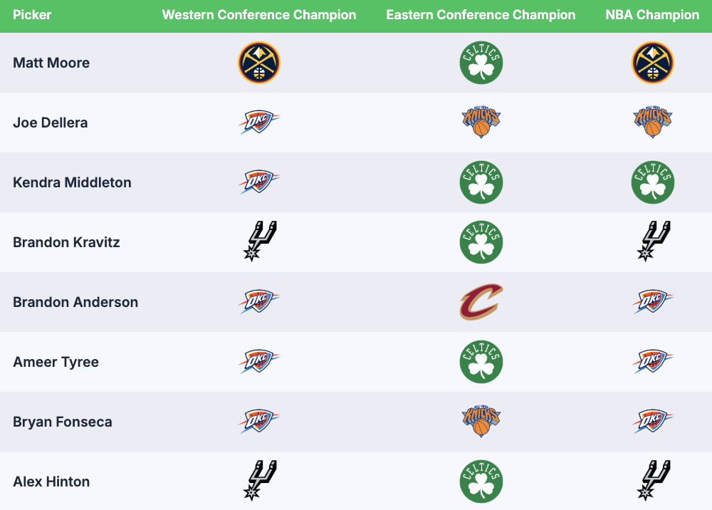 As you can see, we have a lot of faith in the Thunder to make another deep run, but we're not discounting the Spurs or Nuggets either. In the East, there's a bit more consensus, with the staff mostly targeting the Knicks and Celtics. However, Brandon Anderson feels the Cavaliers have some life, too.