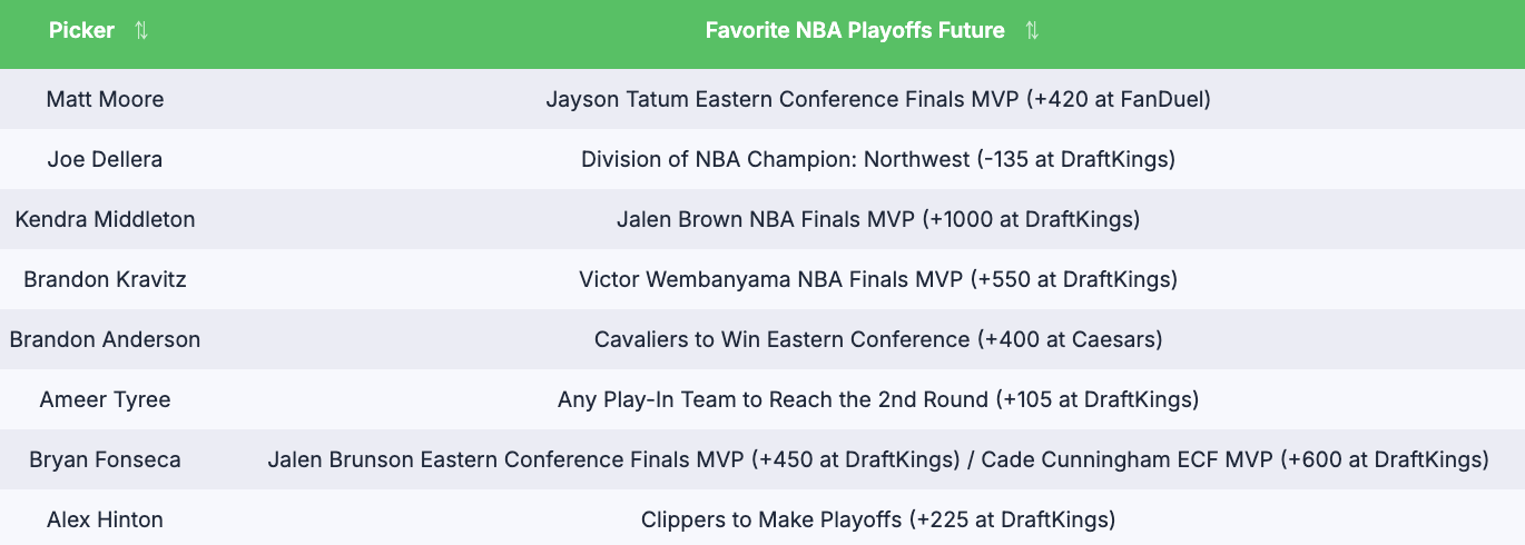 Picks are great, but bets are what we do best at Action Network, and we know you also want some picks. So, we did that too. We also asked our staff for their favorite NBA playoffs futures bet, and compiled those responses — including two plays at +1000 or better — below.