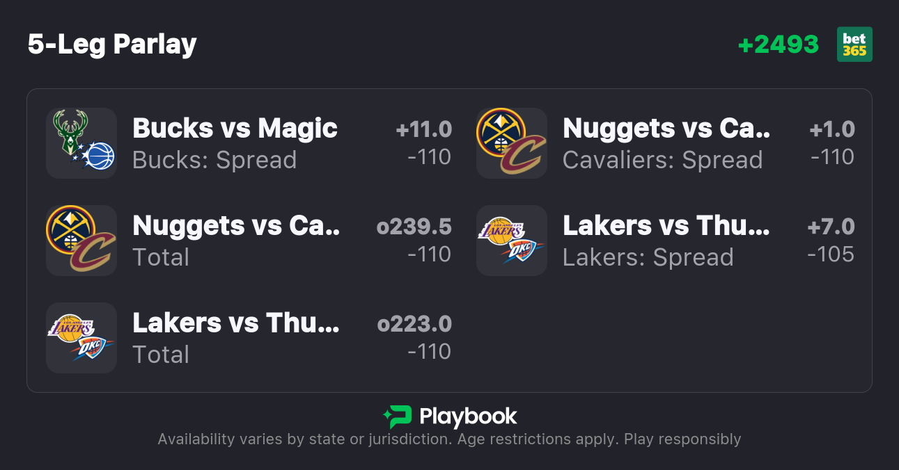 The NBA regular season is back in action with a solid 10-game slate this Monday. So, I've locked in five picks spanning three of today's contests, including bets for Bucks vs. Magic, Cavaliers vs. Nuggets, and Thunder vs. Lakers.
