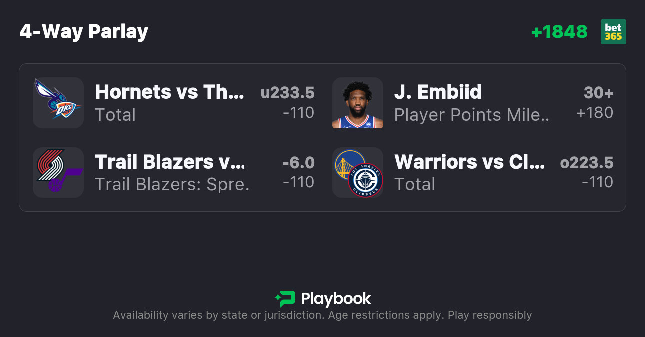 So, I've locked in picks for four of tonight's contests, including bets for Nuggets vs 76ers, Hornets vs Thunder, Warriors vs Clippers, and more.