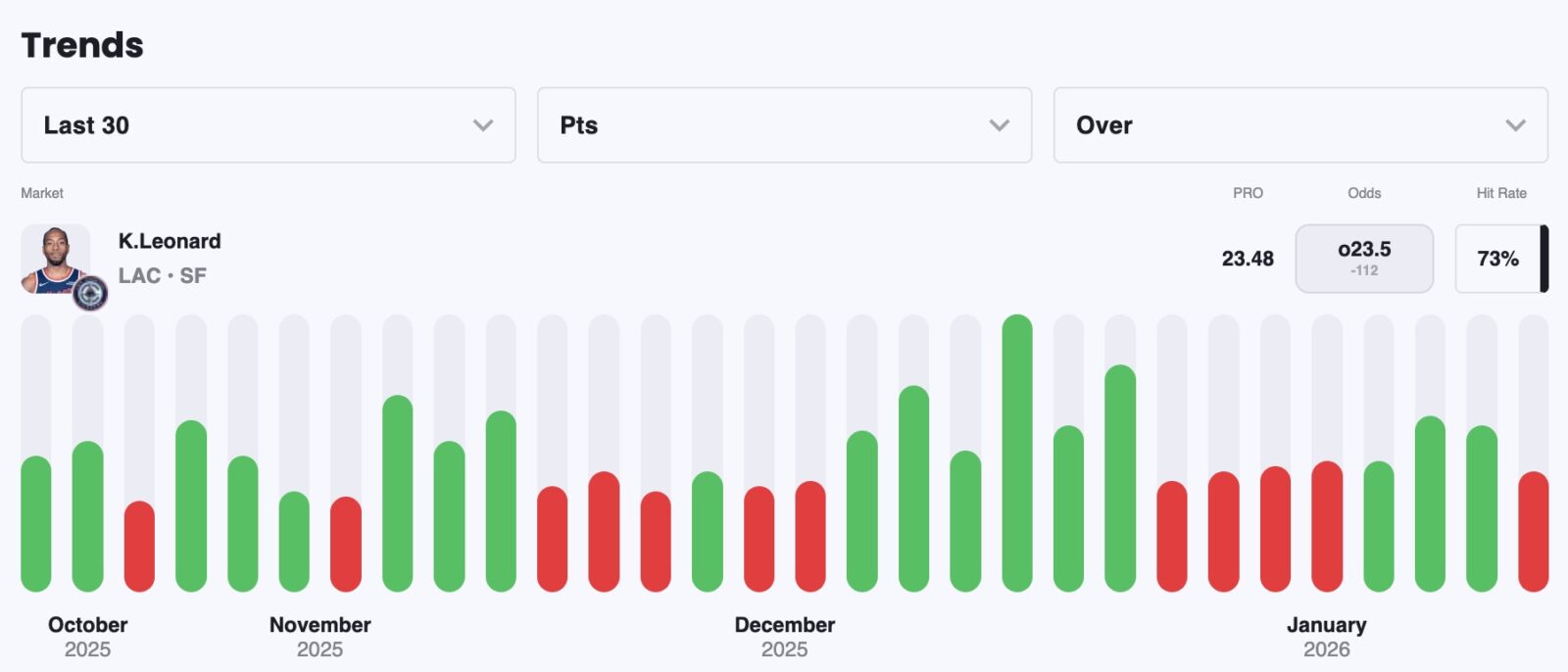 Leonard has been destroying this number this season. He is averaging 28.1 points per game, while going over this number in nine of his last 10 games.