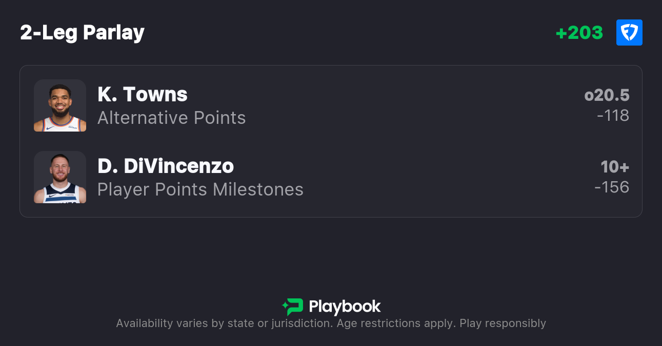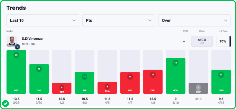 For my second prop, we’re heading to the Western Conference, where the Timberwolves are looking to even their series with the Nuggets. I’m targeting Donte DiVincenzo to go over 10.5 points, a line that feels slightly undervalued given his role in the Wolves' rotation.