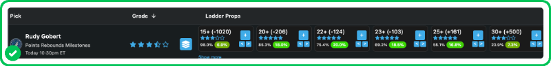 The market has set Gobert’s standard P+R line at 21.5, but the 25+ P+R milestone (+161) is where the math starts to break. Our projections have Gobert marked for a 55.1% win probability on this number, representing a huge 16.8% edge.