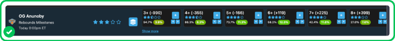 Our Pick Labs Projections give the 7+ Rebounds (+225) milestone a nice 11.6% edge with a 42.4% win probability. For those looking to climb the ladder, the 8+ (+399) rung also remains statistically undervalued given our projected hit rate of 27.6% (7.6% edge).
