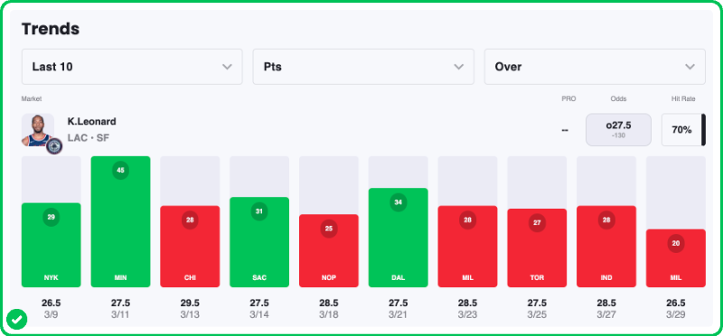 Kawhi enters tonight's game having scored 25 points in nine of his last 10 games and averaging 29.5 points per game during that stretch. He owns a 36.3% usage rate and is shooting 54% from the field in that span.