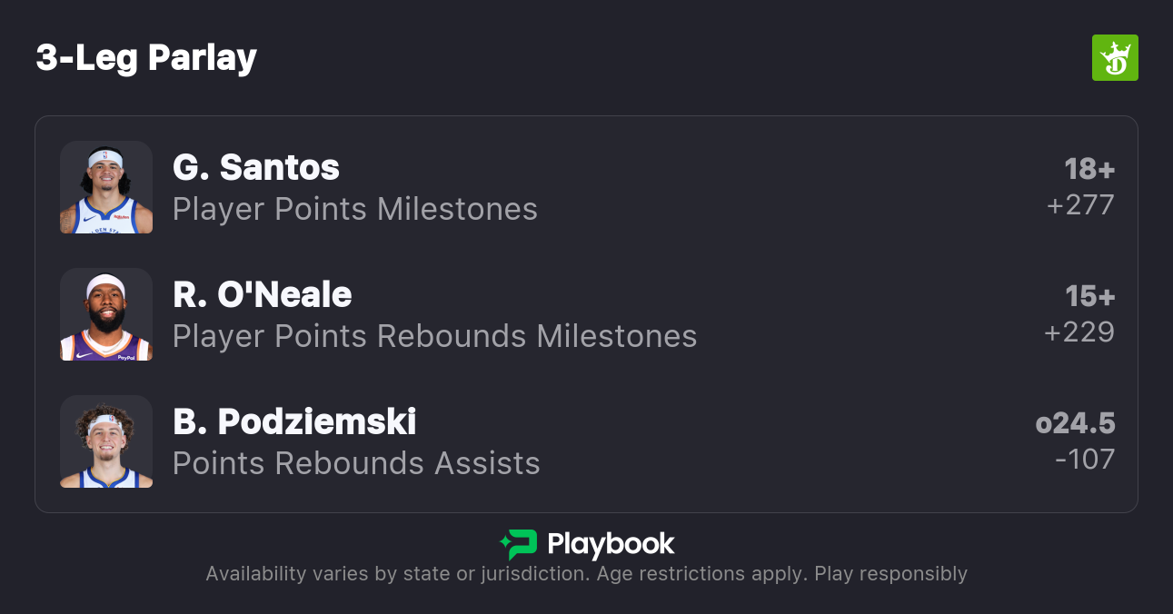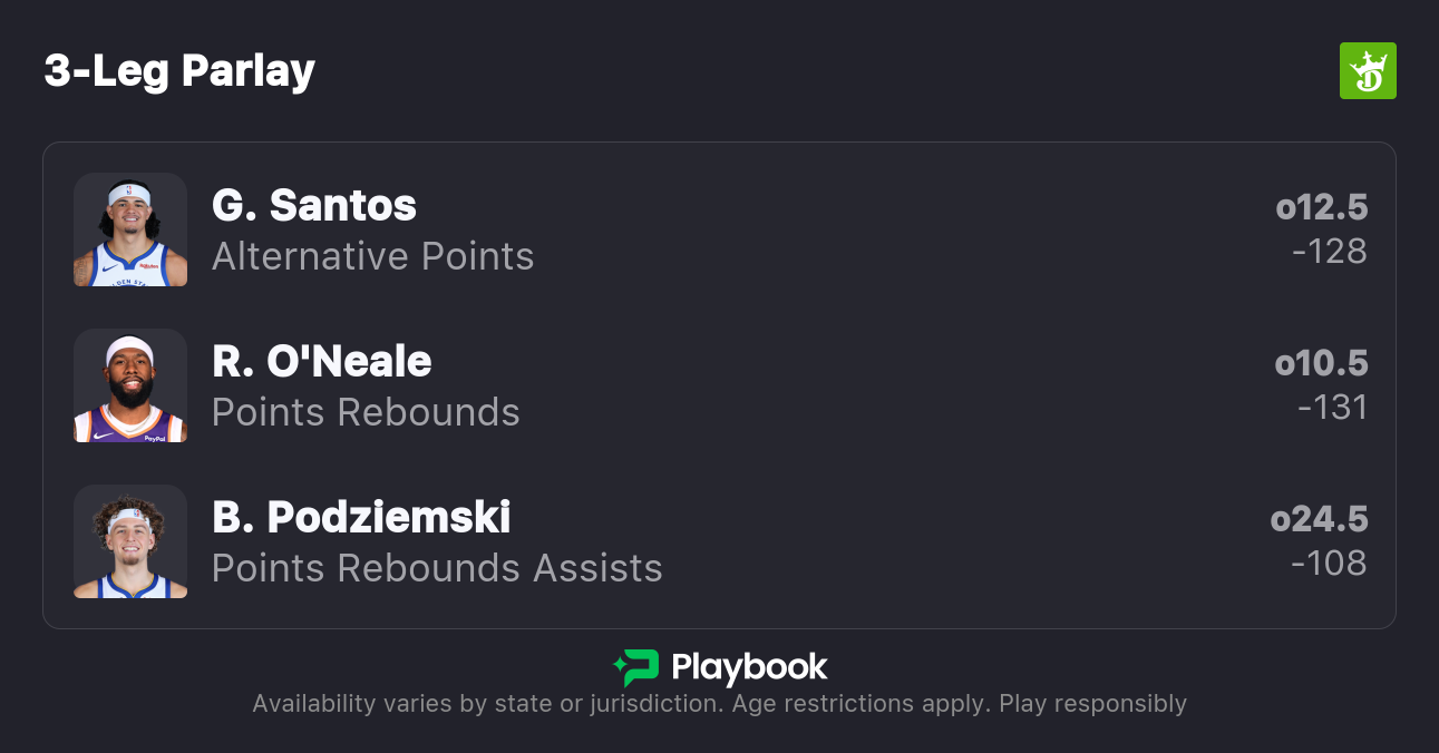 Additionally, as one of the younger players on an experienced team, Podziemski is not subject to minutes restrictions. If he plays over 35 minutes again tonight, he will have a strong chance to record 25 PRA tonight. Both he and Santos should benefit from the attention the Suns pay to slowing down Curry tonight.