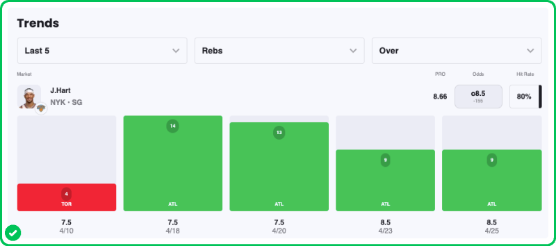 Hart has recorded nine rebounds in each of the first four games in this series and is he averaging 11.3 rebounds per game in the series. In Games 1 and 2, he had 14 and 13 rebounds. He took advantage of his chances as he had 19 rebound chances in both games. He is averaging 17 rebound chances per game in the series and collecting at least half of them will help him clear his rebounds again.