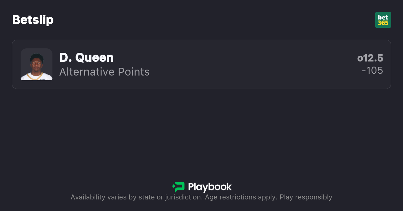 - Derik Queen Over 12.5 Points (-105, bet365)