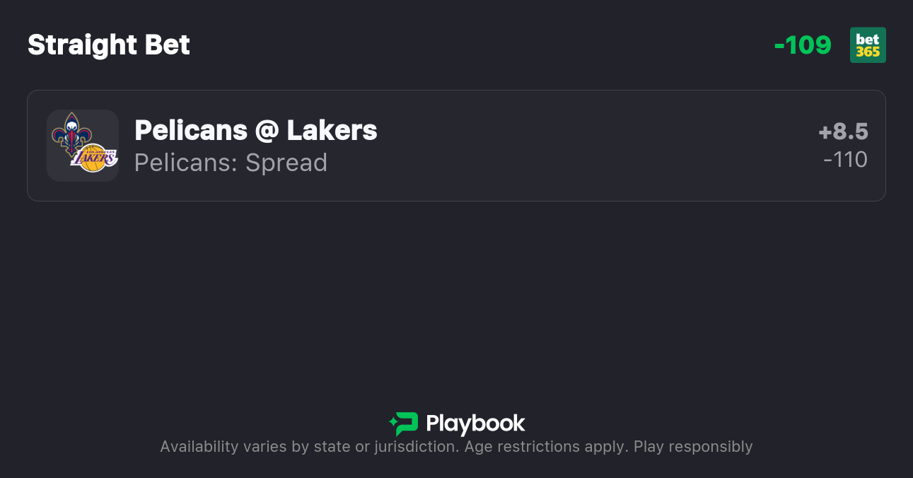 The Lakers are 8.5-point favorites over the Pelicans on the spread (Lakers -8.5), with the over/under set at 243 total points. Los Angeles is a -350 favorite to win outright on the moneyline, while New Orleans is +275 to pull off the upset.
