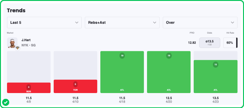 - Knicks vs Hawks pick: Josh Hart Over 13.5 Rebounds & Assists (-120)