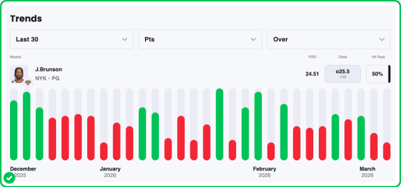 Jalen Brunson has played nine games against teams that are bottom-10 in allowing mid-range attempts and mid-range FG%, and his hit rate on this prop line is 7-for-9 (77%) in those spots.