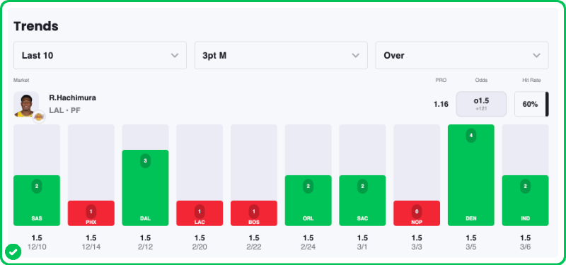 • Rui Hachimura Over 1.5 Three-Pointers Made (+122)