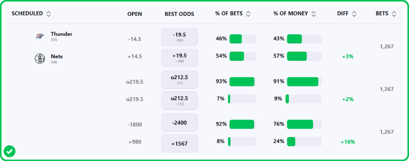 The Thunder are 19.5-point favorites over the Nets on the spread (Thunder -19.5), with the over/under set at 214.5 total points. Oklahoma City is a -2500 favorite to win outright on the moneyline, while Brooklyn is +1200 to pull off the upset.