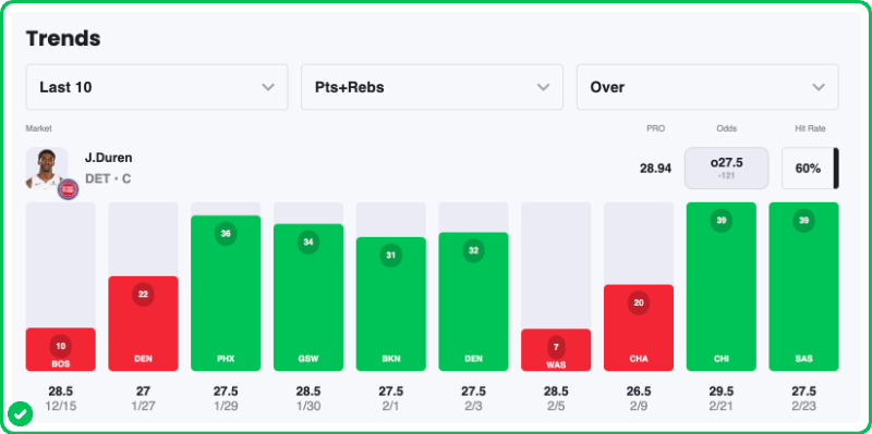 Pick: Jalen Duren Over 27.5 Points & Rebounds (-121)