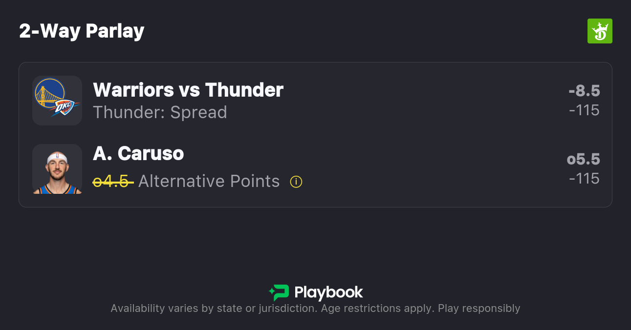 My Warriors vs Thunder best bet is a parlay combining OKC to cover the spread and Alex Caruso over 5.5 points, with the best price currently available at DraftKings. But as always, make sure to find the best odds by checking our live NBA odds page.