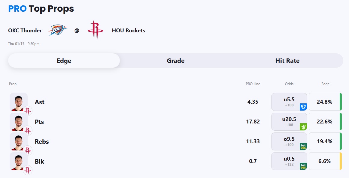 - Thunder vs Rockets pick: Alperen Sengun Under 5.5 Assists (+102)