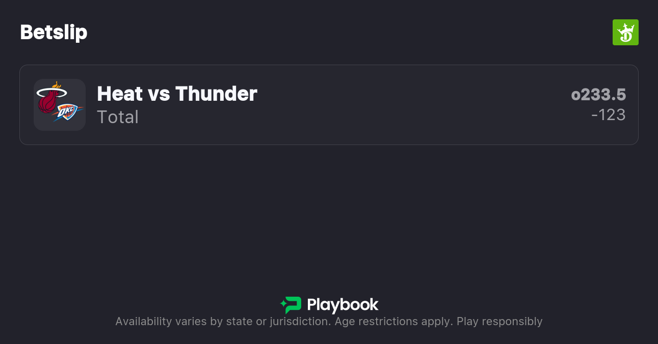 - Thunder vs Heat pick: Over 233.5 (-121) | Play to 234.5Â