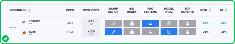The Thunder are 10.5-point favorites over the Suns on the spread (Thunder -10.5), with the over/under set at 213.5 total points. Oklahoma City is a -500 favorite to win outright on the moneyline, while Phoenix is +380 to pull off the upset.