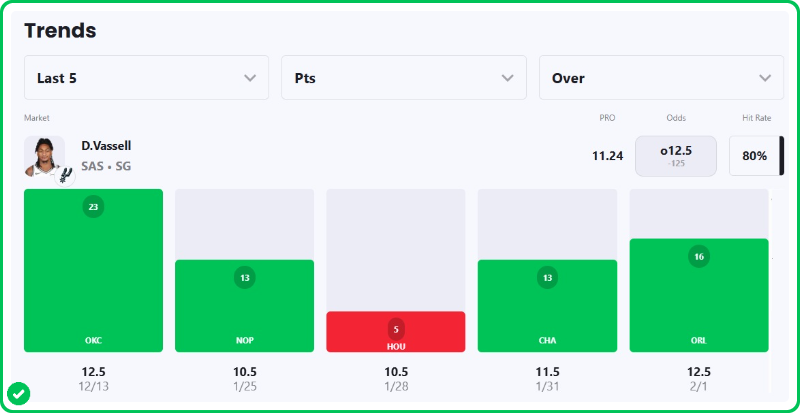 Pick: Devin Vassell Over 12.5 points (-125, bet365)