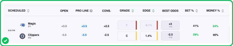 Action PRO projects the spread for this game at Clippers -3.5, giving us a 1.4% edge with Los Angeles to cover the spread against the current line of Clippers -2.5, which is good enough for a C-grade in our database.