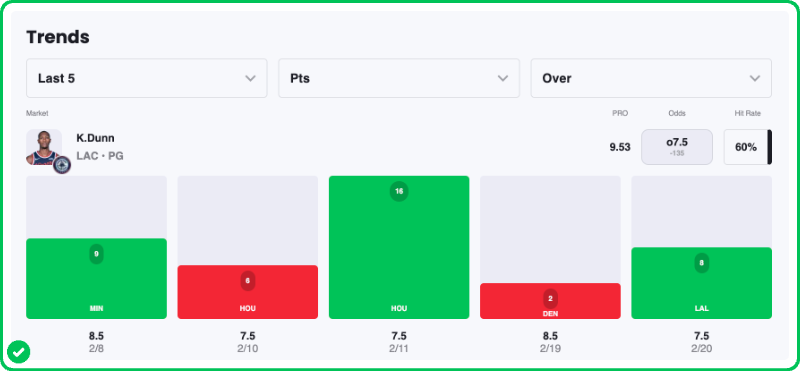 Action PRO is projecting 9.53 points for Kris Dunn in the Clippers' matchup against the Magic tonight, presenting a 17.9% edge against his current points prop line of over/under 7.5, which gives the Over a solid A-grade in our database.