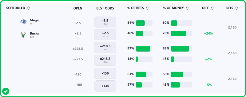 The Magic are 4-point favorites over the Bucks on the spread (Magic -4), with the over/under set at 218.5 total points. Orlando is a -160 favorite to win outright on the moneyline, while Milwaukee is +135 to pull off the upset.