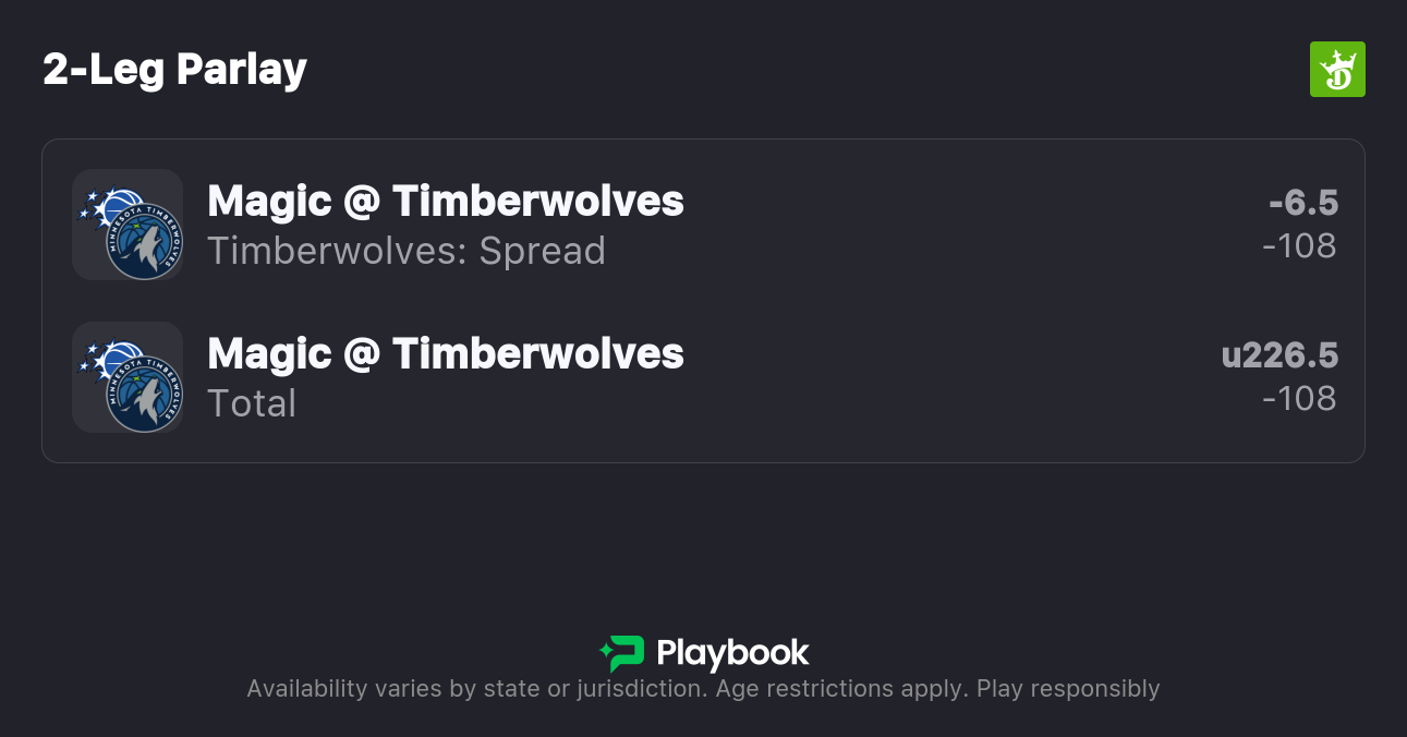 The Timberwolves are 6.5-point favorites over the Magic on the spread (Timberwolves -6.5), with the over/under set at 226.5 total points. Minnesota is a -245 favorite to win outright on the moneyline, while Orlando is +200 to pull off the upset.