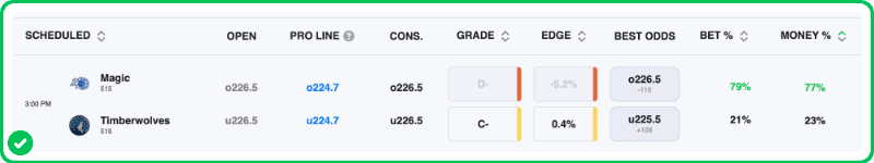 I make this total right around the number (OU 226.5), but the Under is 20-9 when the Wolves are favored at home this season.
