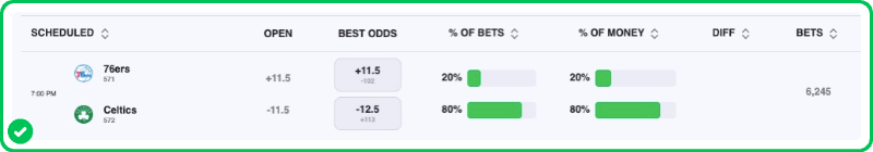 The Celtics are 11.5-point favorites over the Sixers on the spread (Celtics -11.5), with the over/under set at 214.5 total points. Boston is a -550 favorite to win outright on the moneyline, while Philadelphia is +410 to pull off the upset.