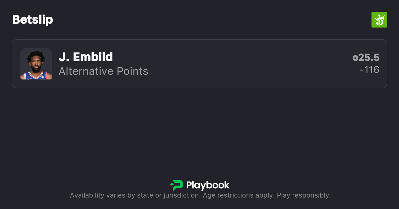 Pick: Joel Embiid Over 25.5 Points (-116, DraftKings)